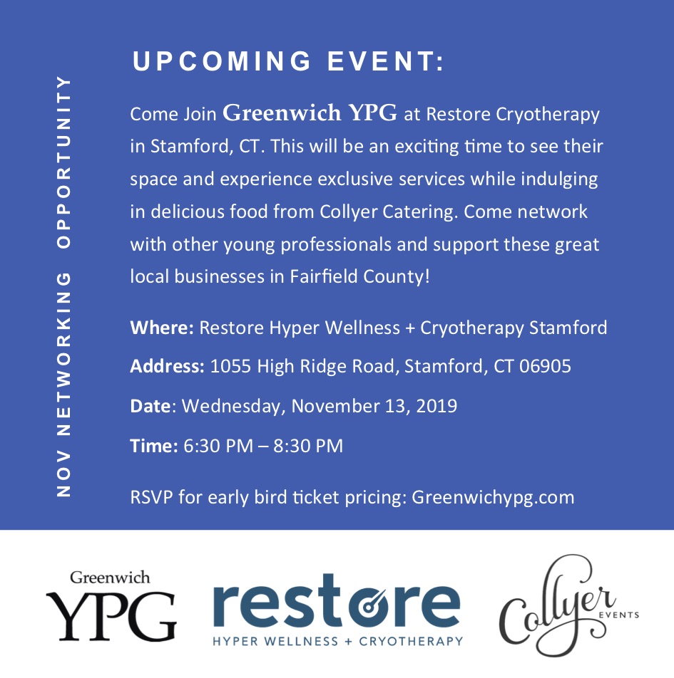 Come join Greenwich YPG at Restore Cryotherapy in Stamford, CT. This will be an exciting time to see their space and experience exclusive services while indulging in delicious food from Collyer Catering. Come network with other young professionals and support these great local businesses in Fairfield County!