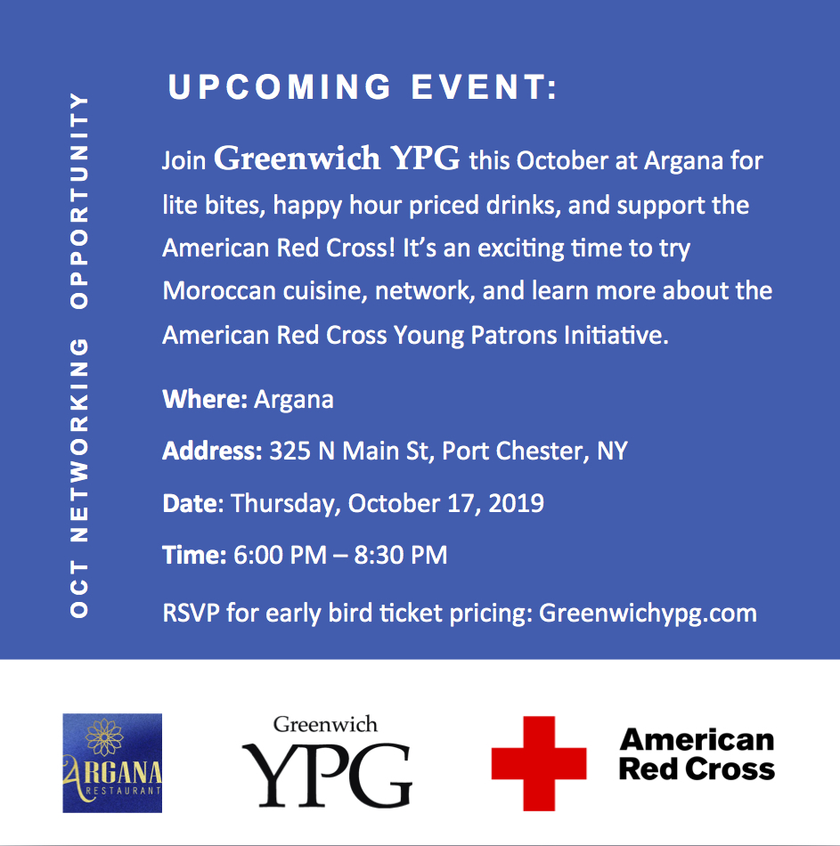 Come join Greenwich YPG for light bites and happy hour priced drinks at a local restaurant in Port Chester, NY. This will be an exciting time to try Moroccan cuisine, network, and learn more about American Red Cross Metro NY North’s New Young Patrons Initiative. Come network with other young professionals, support a great cause, and learn more about Young Patrons. 50% of the net proceeds will be donated to the American Red Cross.